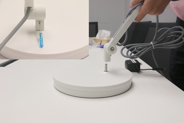 WiT的安裝十分簡(jiǎn)單,直接將主體底部套在底座的金屬柱上,用螺絲刀固定住即可。